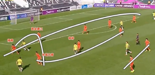 通过锋线这样的压迫,使得对方不能轻松倒脚,也就无法真正找寻到机会。尤其是我们的球员身高不错,有一定的防空和对抗优势。