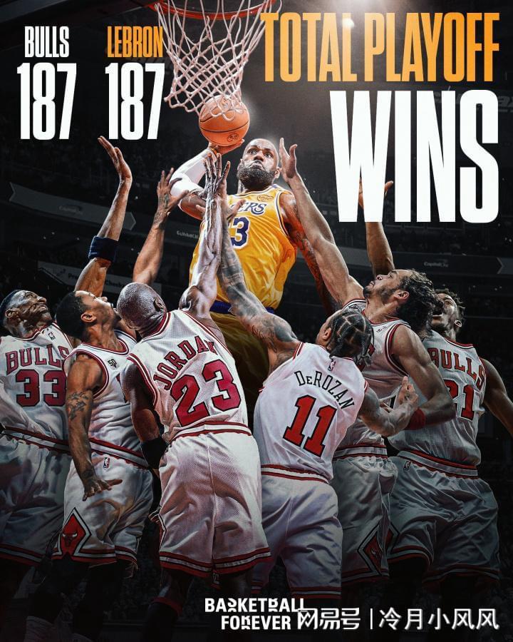 今日,据美国知名体育媒体《Basketball Forever》报道,昨天这场比赛打完以后詹姆斯季后赛胜场数来到了187场,追平了整个芝加哥公牛队的历史胜场数。要知道,公牛历史上球星频出,不仅有乔丹、皮蓬这样的超巨,也有罗斯、巴特勒、诺阿、德罗赞这样的全明星,詹姆斯一人追平全队胜场数真是有些不可思议。